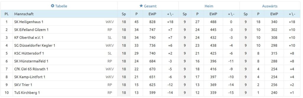 Am Ende gewann Gilzem verdient in Trier und sicherte sich mit dem Auswärtsdreier und 44 Zusatzwertungen, begünstigt durch die gleichzeitige 0:3-Niederlage der Kegelfreunde Oberthal in Düsseldorf, den zweiten Tabellenplatz. Damit startet die SK Eifelland Gilzem bei ihrer erstmaligen Teilnahme an der Meisterrunde der 1. Bundesliga mit einer Punktevorgabe von drei Punkten in die Finalrunde. Gegner sind die erstplatzierten Heljens Red Lions aus Heiligenhaus (4 Punkte), KF Oberthal (2 Punkte) sowie die SG Düsseldorfer Kegler (1 Punkt).